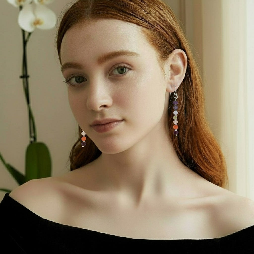 Multicolored 7 Gemstone Chakra with Faceted Beads 925 Sterling Silver Elegant Earrings