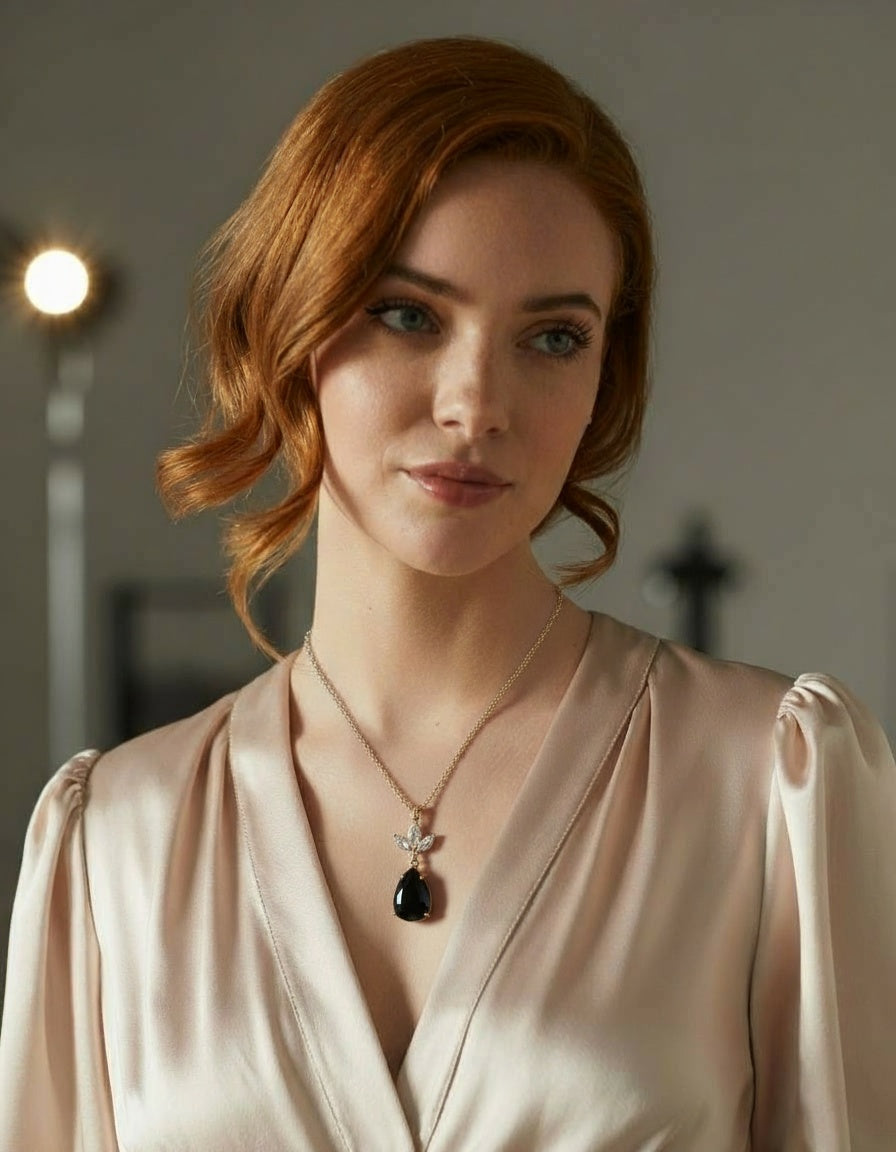 This Victorian-inspired necklace features a pear-shaped simulated emerald centerpiece surrounded by sparkling cubic zirconia accents, all set in a rich gold-plated finish. Its elegant design captures the timeless allure of classic jewelry while providing the brilliance and sophistication of fine gemstones. Perfect for adding a refined touch to formal attire or enhancing a vintage-inspired look with expert craftsmanship and quality materials. Necklace is 18" in length and can be extended to 20", pendant measures 1"X0.4".